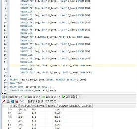 [Oracle] 계층형 원 조상 가져오기(CONNECT_BY_ROOT) WITH TEMP AS ( SELECT '0' Seq, NULL P_Level, 'A-1' C_Level FROM DUAL UNION ALL SELECT '1' Seq,'A-1' P_Level, 'A-2' C_Level FROM DUAL UNION ALL SELECT '2' Seq,'A-1' P_Level, 'A-3' C_Level FROM DUAL UNION ALL SELECT '3' Seq,'A-2' P_Level, 'A-4' C_Level FROM DUAL UNION ALL SELECT '4' Seq,'A-4' P_Level, 'A-5' C_Level FROM DUAL UNION ALL SELECT '5' Seq,'A-5' P_..