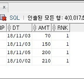 [Oracle] 그룹별 최종일자 ROW 가져오기 WITH TEMP AS ( SELECT 'A' GRP, TO_DATE('2018-11-01','YYYY-MM-DD') DT, 50 AMT FROM DUAL UNION ALL SELECT 'A' GRP, TO_DATE('2018-11-02','YYYY-MM-DD') DT, 100 AMT FROM DUAL UNION ALL SELECT 'A' GRP, TO_DATE('2018-11-03','YYYY-MM-DD') DT, 70 AMT FROM DUAL UNION ALL SELECT 'A' GRP, TO_DATE('2018-11-03','YYYY-MM-DD') DT, 150 AMT FROM DUAL UNION ALL SELECT 'B' GRP, TO_DATE('2..